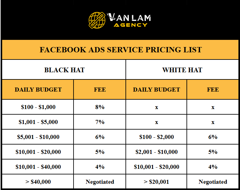 VanLam Agency Facebook Ads Service Pricing is crafted to fit any budget, helping businesses target the right audience, maximize conversions, increase ROI, and strengthen brand presence. Explore our flexible pricing plans for both Black Hat and White Hat strategies to find the perfect match for your marketing goals.